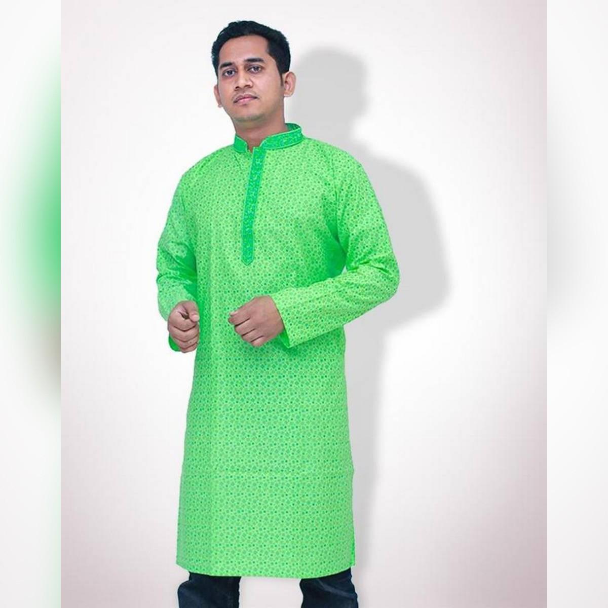 Green Cotton Semi Long Panjabi for Men
