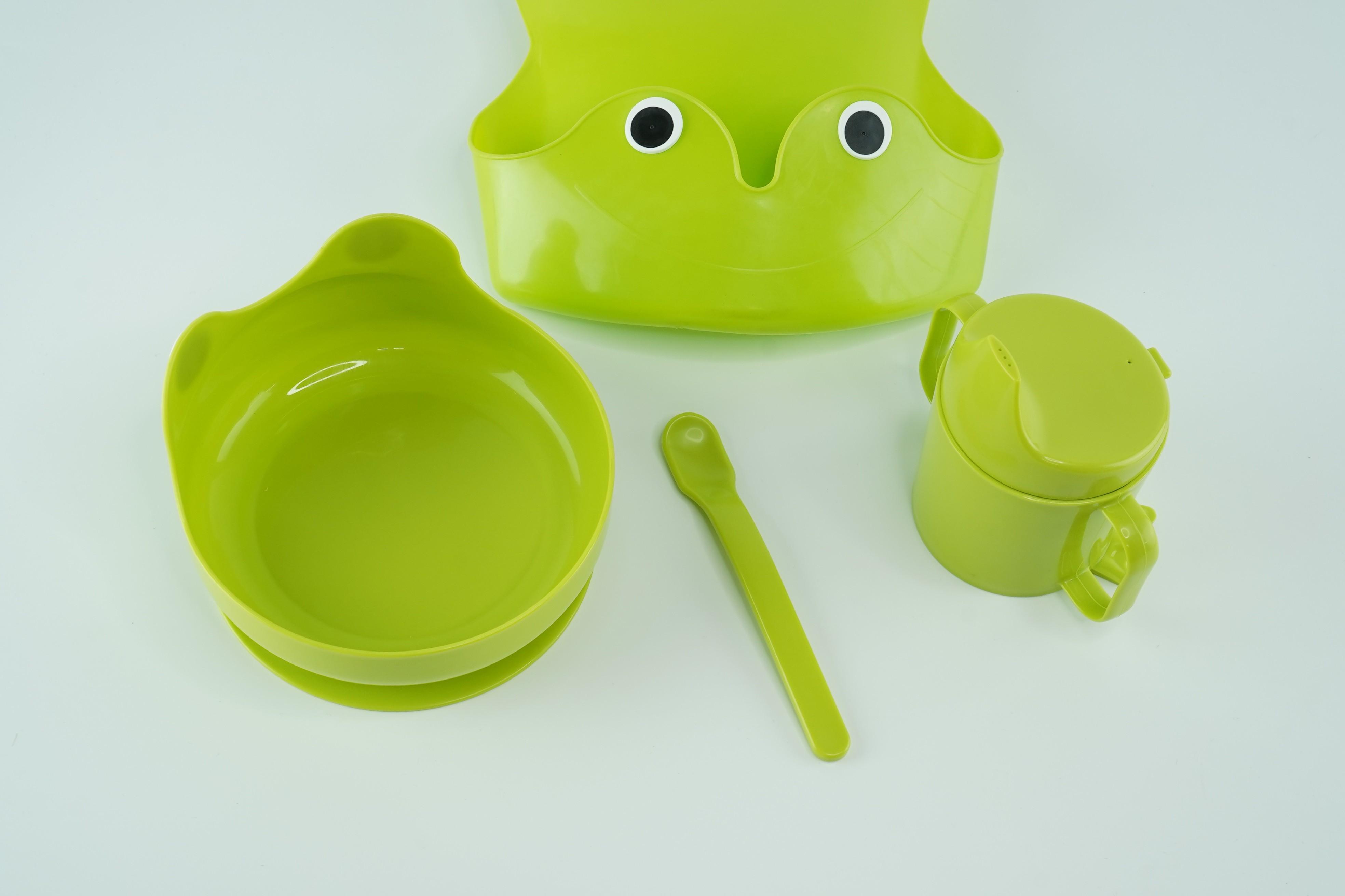 And the small frog feet mean that the beaker stands steady on table. The bib’s neck opening is adjustable and the generous food catching pocket is easy to rinse.The lid is formed with room for a child's nose so it is comfortable to drink from, without leaning the head back.The spoon is adapted for a small hand and mouth – perfect for when your child wants to start eating by themselves. Recommended for ages from 0 year.Always use this product with adult supervision.