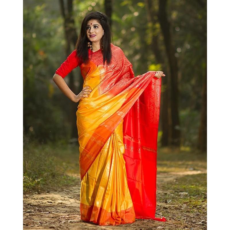 Yellow and Red Half Silk Saree for Women
